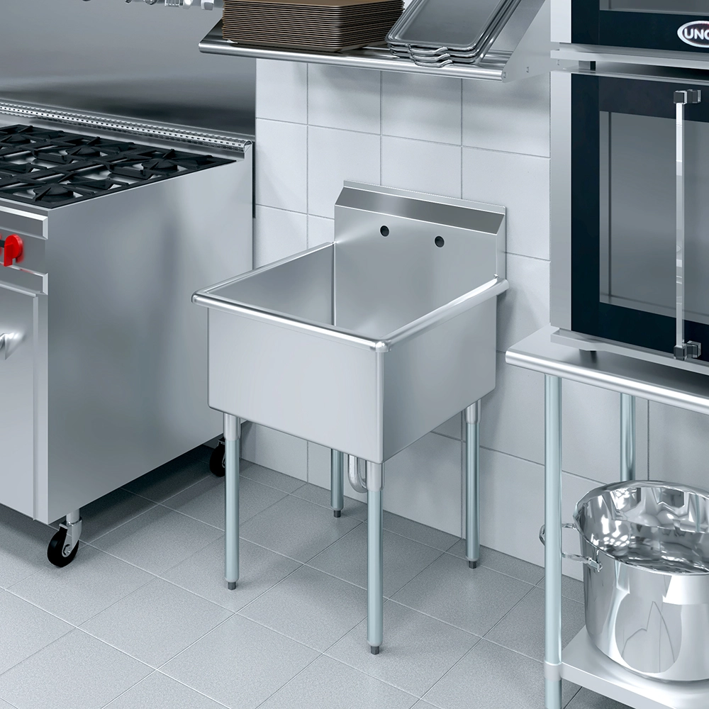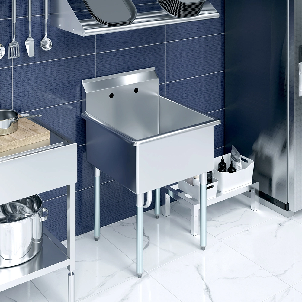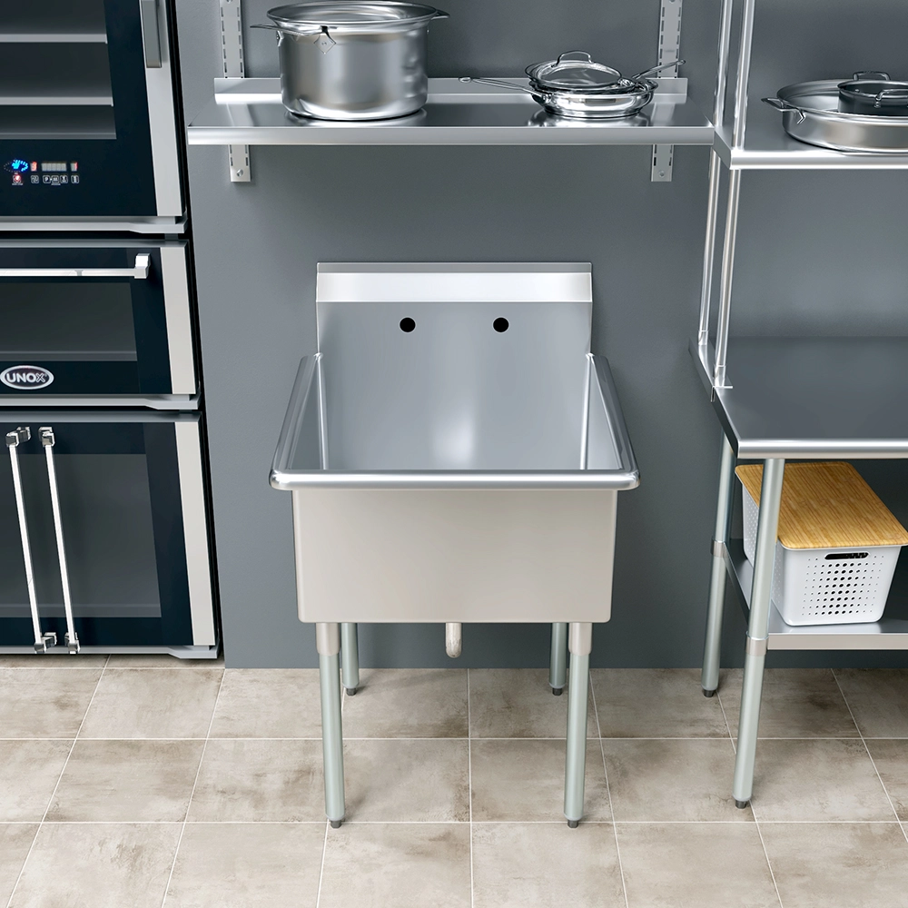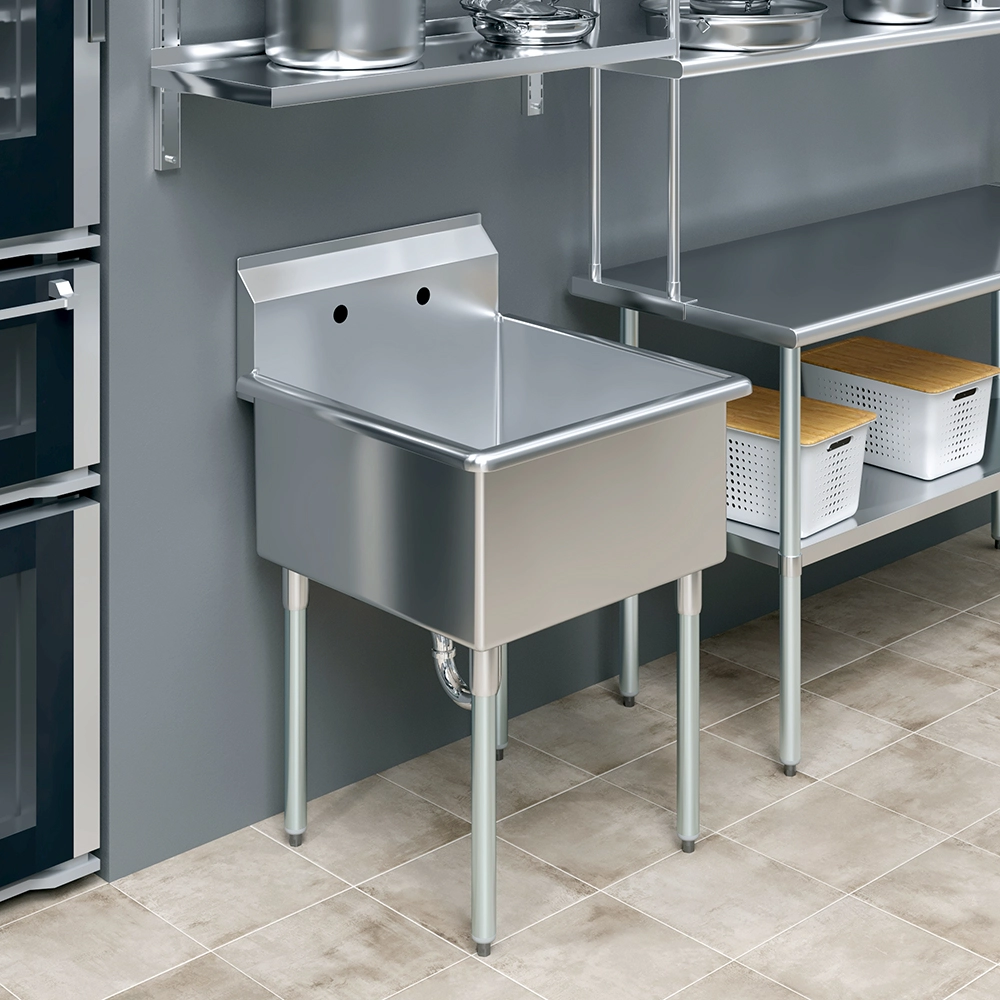 With its spacious basin, measuring 24 inches 24 inches, this sink offers ample room to handle a wide variety of cleaning needs, from washing large pots and pans to rinsing tools, equipment, or laundry. The deep bowl design minimizes splashes and keeps water contained, helping to maintain a cleaner and more organized workspace. Its sturdy construction ensures reliability and stability during heavy use.