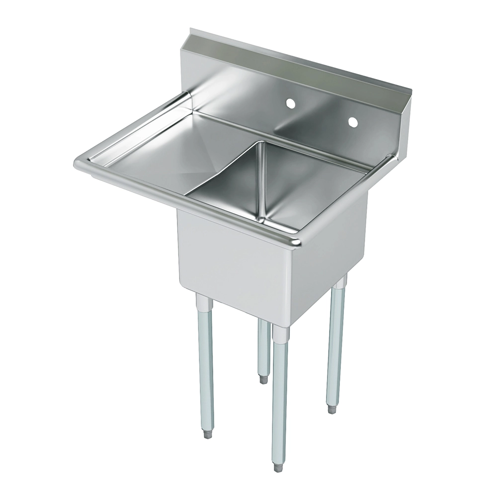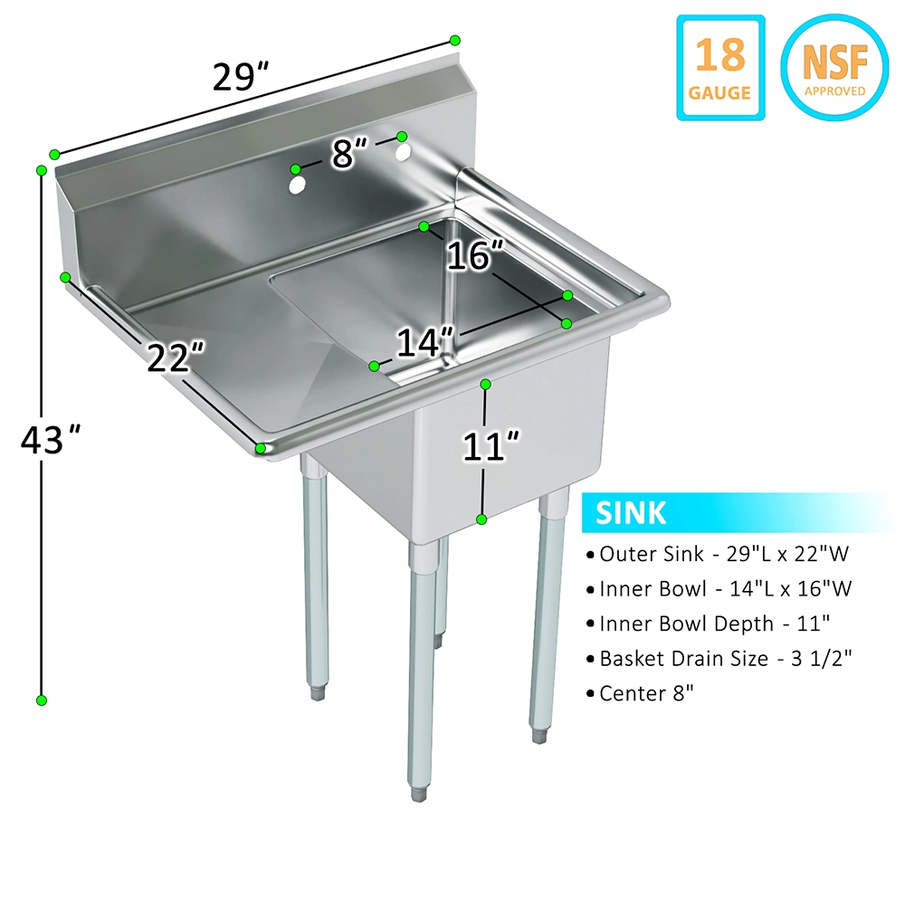 Streamline your workspace with the 29 in. x 22 in. Stainless Steel One-Compartment Sink with a 12 in. left drainboard, a practical and durable solution for various cleaning and prep needs. Crafted from 18GA/304 stainless steel, this sink resists corrosion and stains, ensuring long-lasting performance even in demanding environments like commercial kitchens, utility rooms, or workshops.