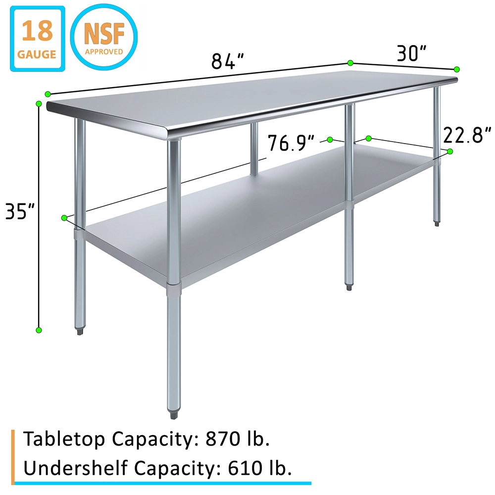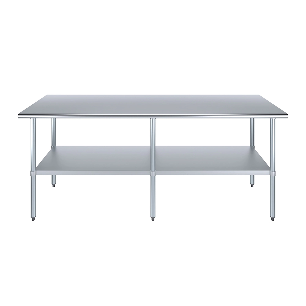 The spacious 30 in. X 84 in. tabletop provides ample workspace for a variety of tasks, including food preparation, equipment handling, and general workspace organization. Its smooth, polished surface is easy to clean and maintain, ensuring a hygienic environment that meets the high standards of any commercial setting.