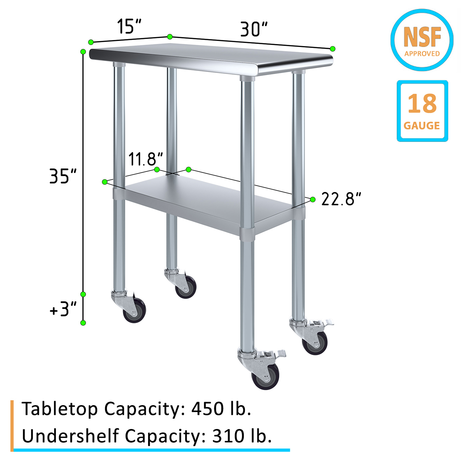 30″ X 15″ Stainless Steel Work Table With Undershelf & Wheels