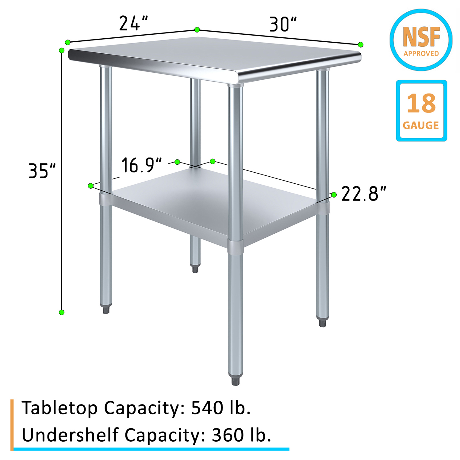 The spacious 30″ x 24″ tabletop provides ample workspace for a variety of tasks, including food preparation, equipment handling, and general workspace organization. Its smooth, polished surface is easy to clean and maintain, ensuring a hygienic environment that meets the high standards of any commercial setting.