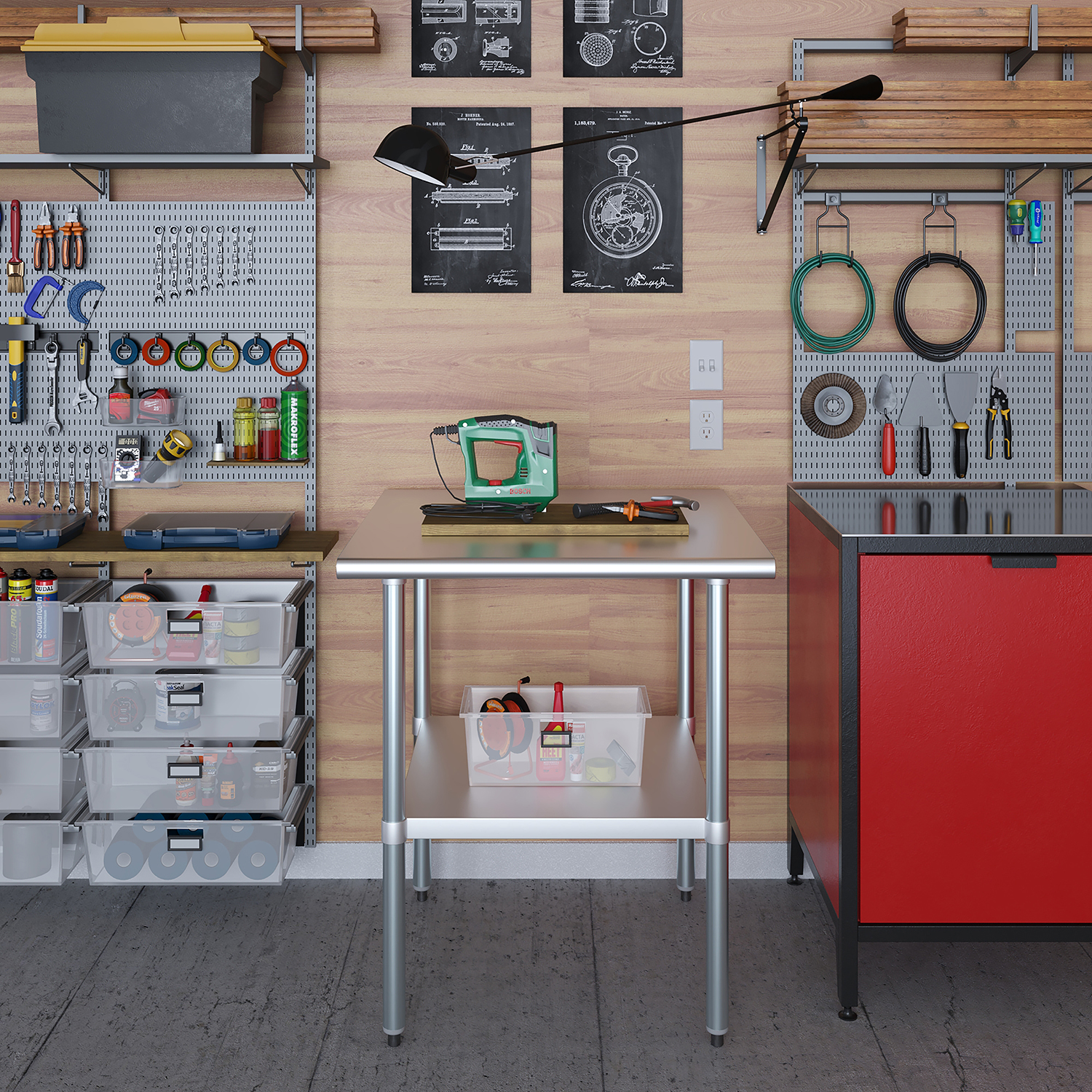 A key feature of this work table is the adjustable undershelf, which offers additional storage space for tools, supplies, and equipment. This undershelf can be positioned at your preferred height, allowing for customized storage solutions that meet your specific needs. Whether you need to store heavy equipment or small utensils, this versatile shelf enhances the functionality of your workspace by keeping essential items within easy reach.