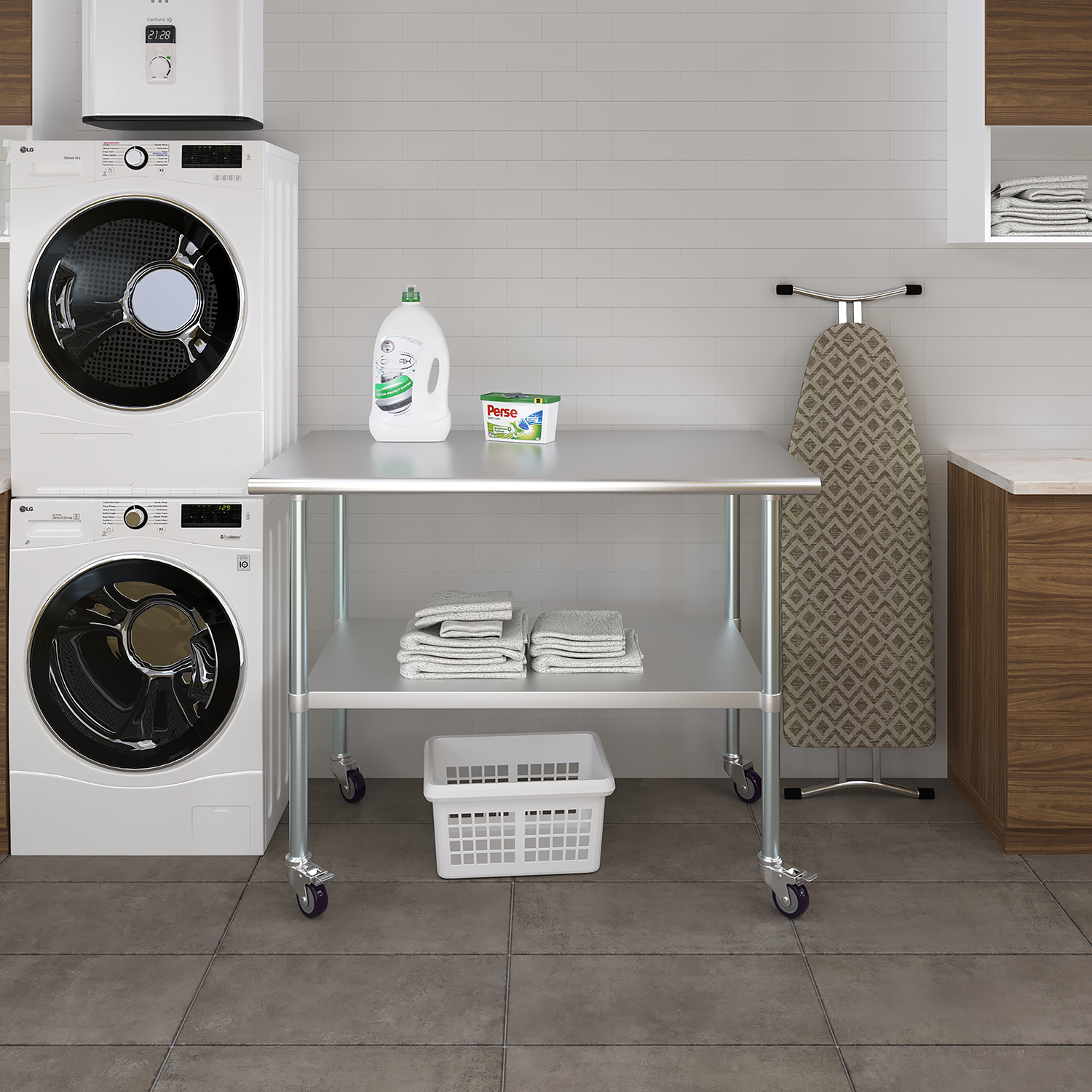 Upgrade your workspace with this versatile and practical work table that combines high functionality with contemporary design. Perfect for enhancing productivity and organization, the 30″ x 48″ Stainless Steel Work Table with Undershelf and Wheels is an indispensable asset for any professional setting, providing durability, convenience, and efficiency in a compact, mobile unit.