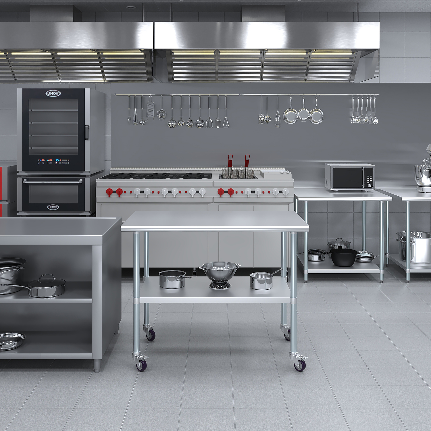 Optimize your workspace with the 30″ x 48″ Stainless Steel Work Table featuring an undershelf and a set of four wheels for enhanced mobility and storage. This work table is constructed from 18GA/430 stainless steel, ensuring a durable, easy-to-clean surface. Designed for demanding environments such as commercial kitchens, laboratories, and workshops, this table guarantees long-lasting performance and reliability.