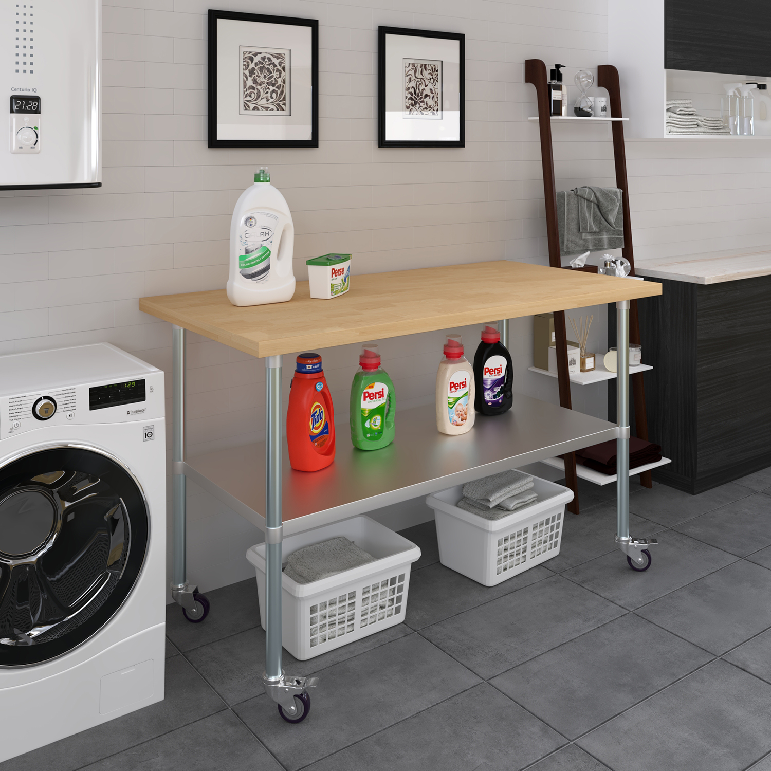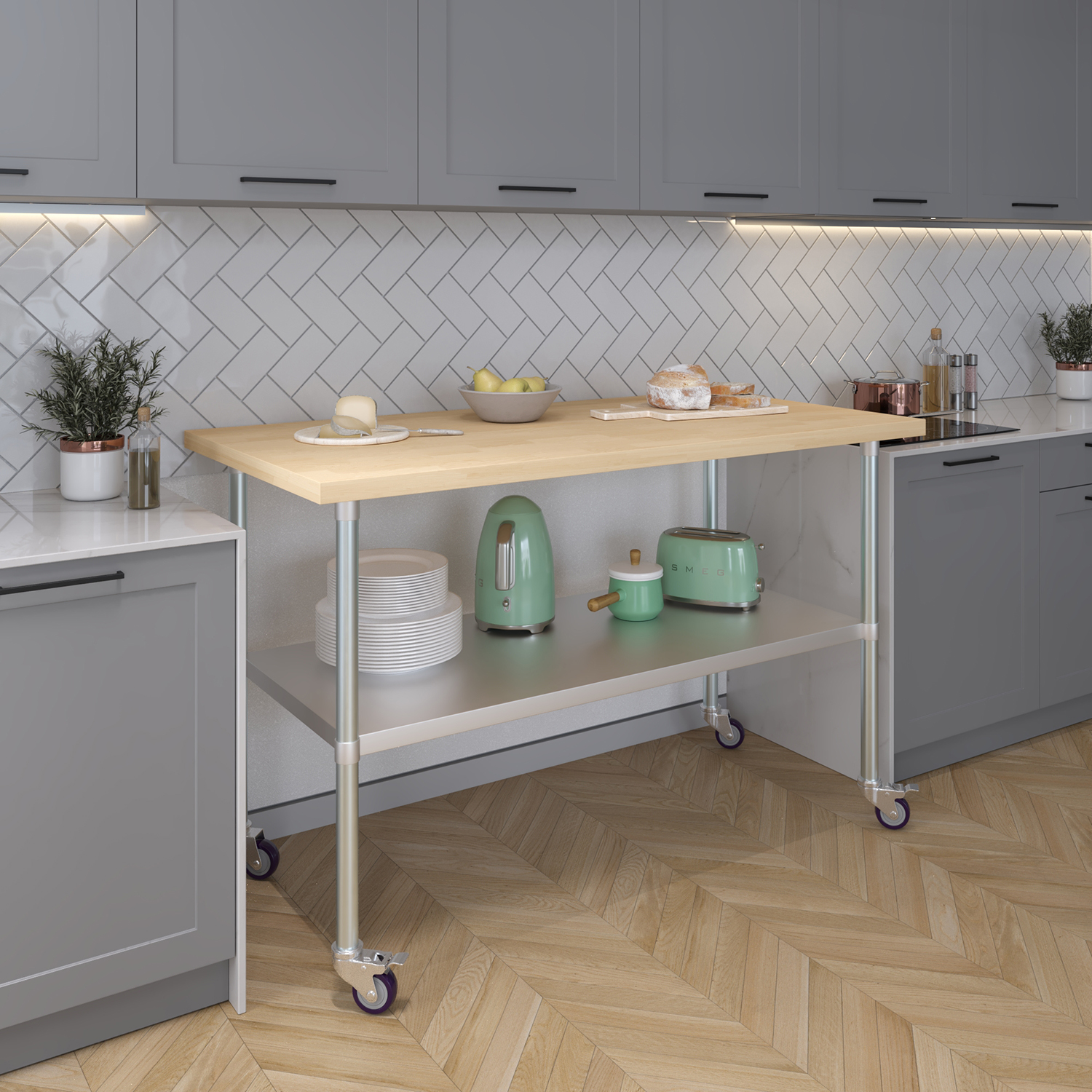The table is designed for easy assembly, with all necessary hardware and clear instructions included. Its sturdy construction ensures that it can handle heavy loads and rigorous use, providing a reliable and durable workspace that stands up to the demands of any professional setting. The easy-to-clean maple wood top and stainless steel undershelf make maintenance simple, promoting a hygienic environment in areas where cleanliness is paramount.