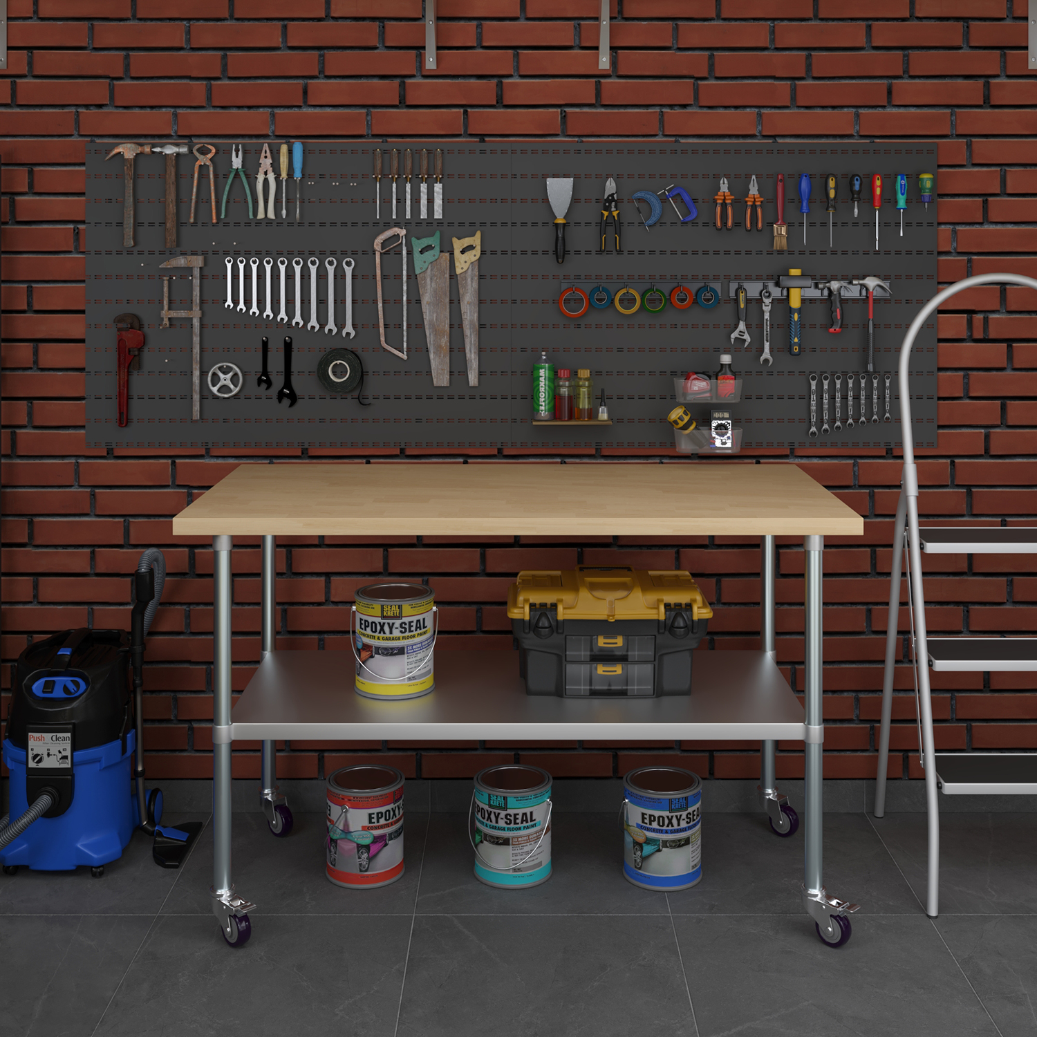 Introducing our 30″ x 60″ Maple Wood Top Work Table with Adjustable Undershelf and Wheels (set of 4), a perfect combination of durability, functionality, and mobility designed to meet the needs of dynamic work environments. This versatile work table features a qualty maple wood top that provides a smooth and sturdy surface, ideal for various tasks such as food preparation, crafting, and assembly work. The natural maple wood not only ensures longevity but also adds a touch of elegance to any setting.