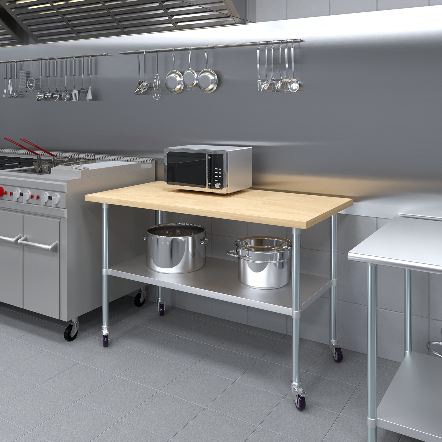 Ideal for both residential and commercial applications, our 30″ x 60″ Maple Wood Top Work Table with Adjustable Undershelf and Wheels is a perfect addition to any workspace. Enhance your kitchen, workshop, or commercial environment with this stylish and practical work table, and experience the benefits of improved organization, efficiency, and mobility. Invest in a quality, versatile work table designed to meet the highest standards of professional use and transform your workspace today.