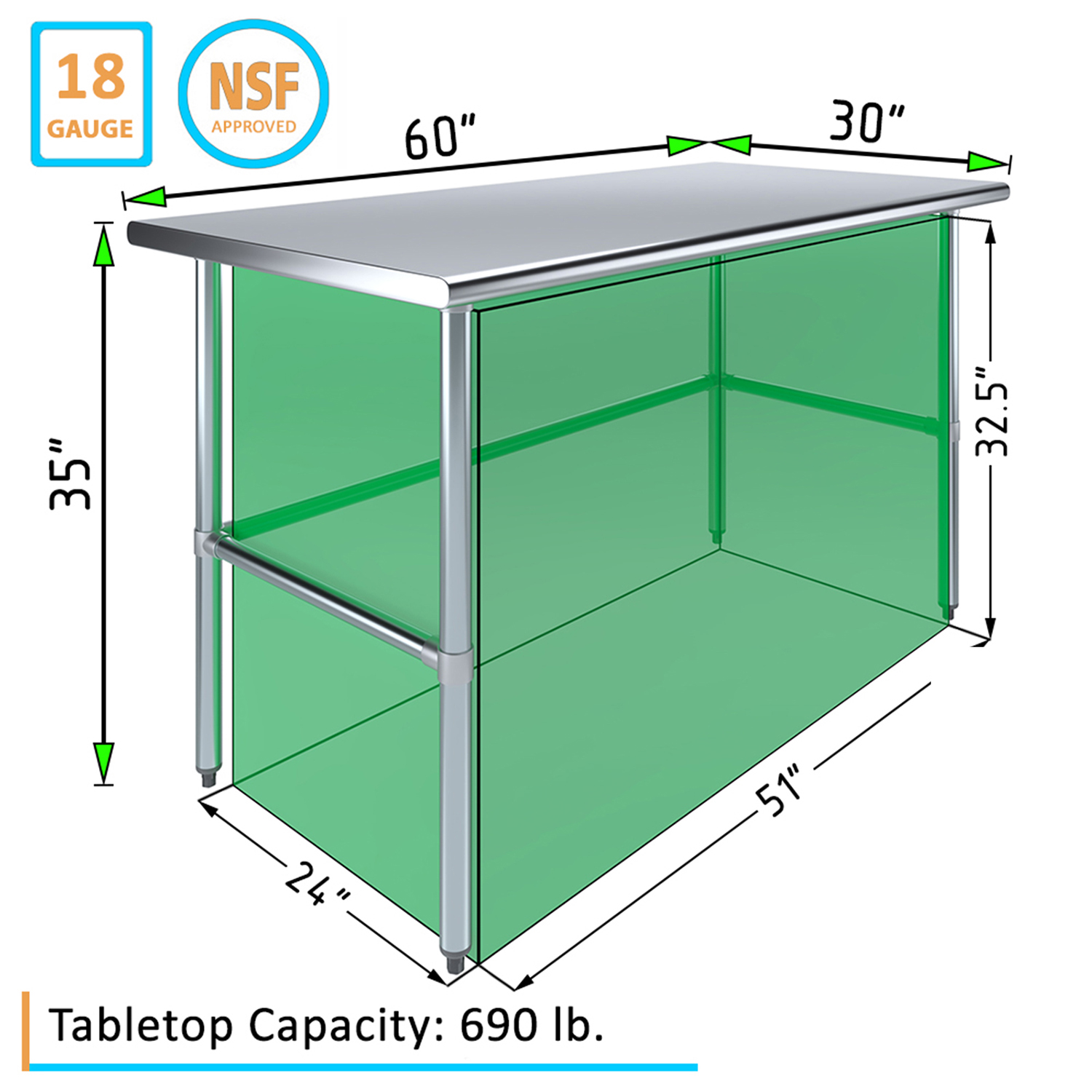 Enhance your workspace with the versatile and durable 30″ x 60″ Stainless Steel Work Table with Open Base. Crafted from 18GA/430 stainless steel, this work table is designed to withstand the rigors of daily use in commercial kitchens, workshops, laboratories, and other demanding environments. Its sleek, smooth surface is not only easy to clean but also resistant, ensuring long-lasting performance and hygiene.