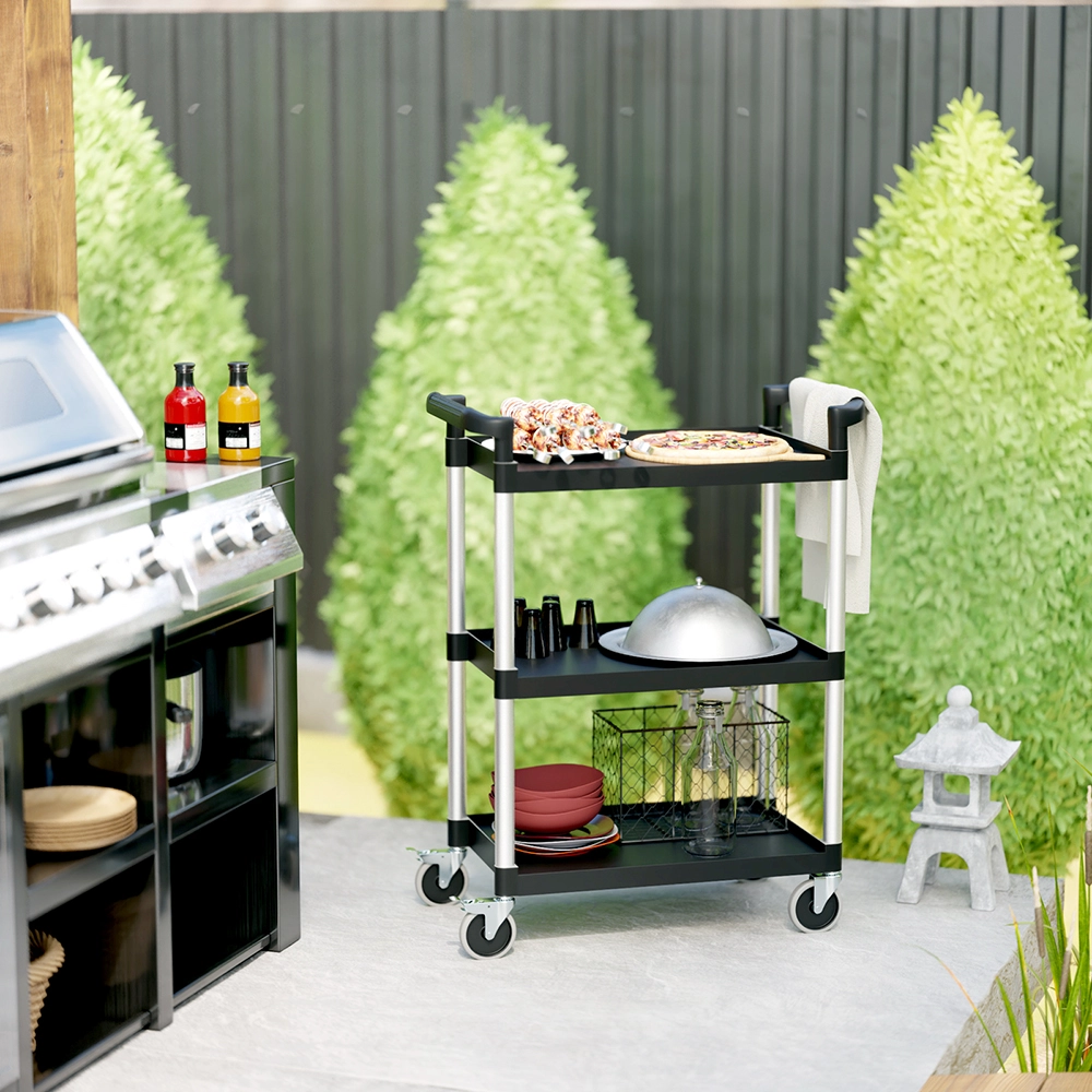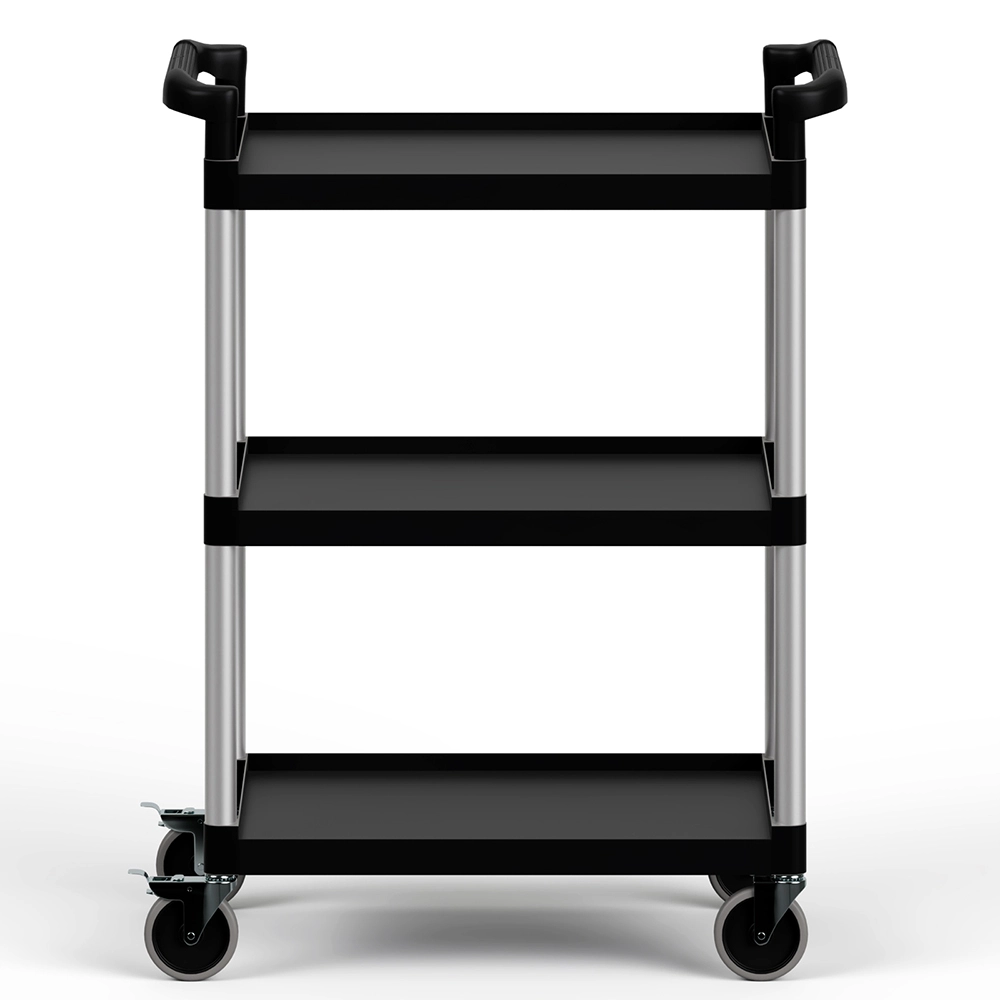 Improve efficiency and organization with this 32 in. x 16 in. Black Utility/Bussing Cart with Three Shelves, designed to handle the demands of fast-paced commercial environments. Built with a durable frame and sturdy shelving, this cart provides reliable support for transporting dishes, supplies, cleaning materials, or equipment with ease. The three spacious shelves offer ample storage capacity, allowing for organized, multi-level transport that reduces trips and saves time.