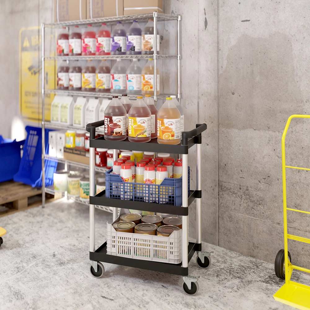 Whether used for bussing tables, restocking supplies, or general utility tasks, this three-shelf cart enhances productivity and workflow. Designed for durability, convenience, and everyday performance, it is an essential tool for efficient material handling in any busy workplace.