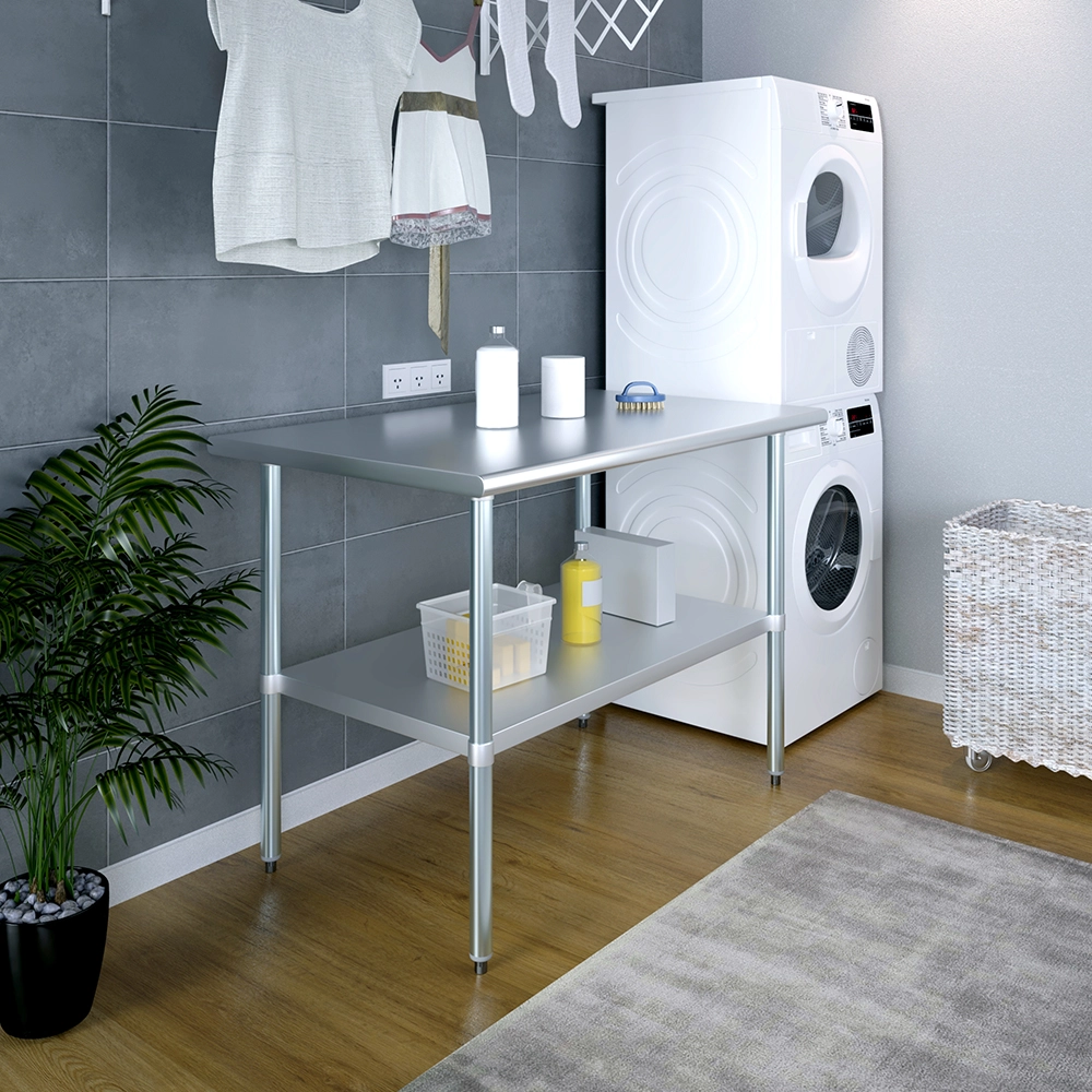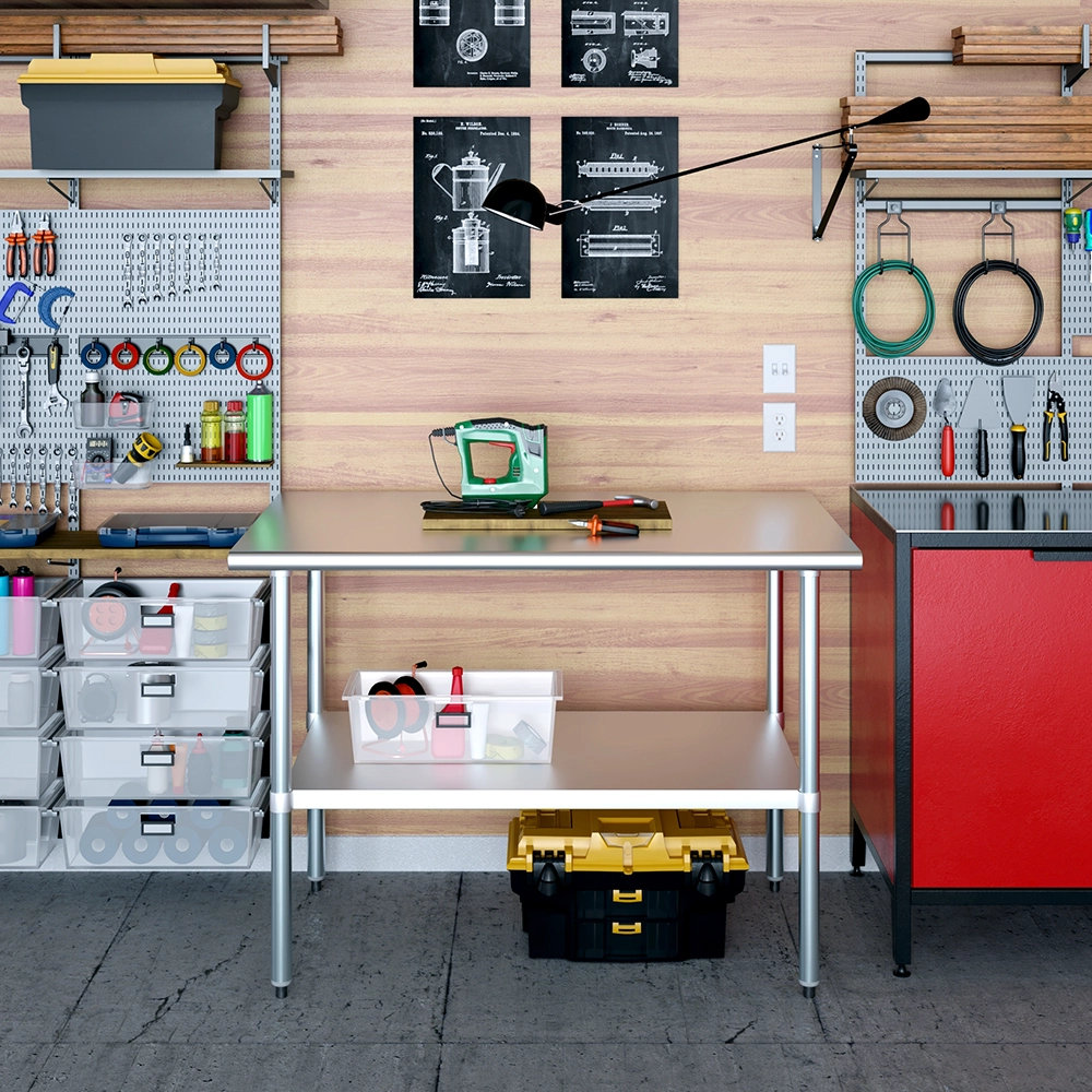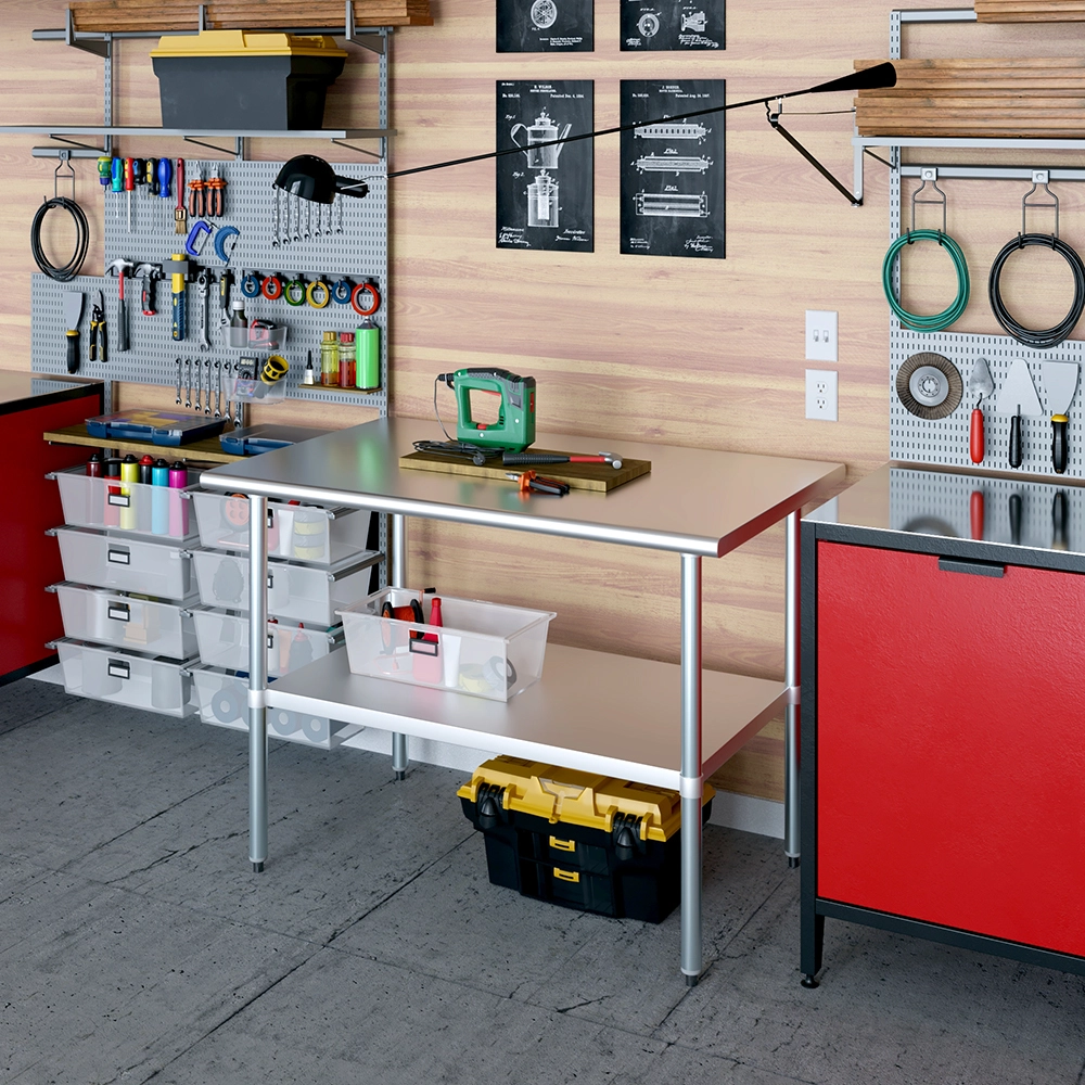 A key feature of this work table is the adjustable undershelf, which offers additional storage space for tools, supplies, and equipment. This undershelf can be positioned at your preferred height, allowing for customized storage solutions that meet your specific needs. Whether you need to store heavy equipment or small utensils, this versatile shelf enhances the functionality of your workspace by keeping essential items within easy reach.