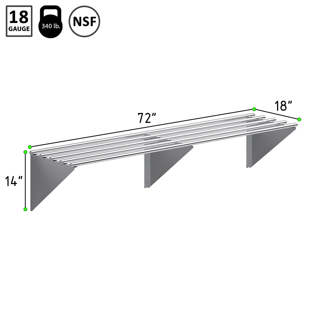 Measuring 72 inches in length and 18 inches in depth, this wall shelf offers generous storage space, perfect for organizing kitchenware, tools, supplies, and more. The robust stainless steel construction ensures long-lasting strength and resistance, even in the most demanding environments. This makes it an ideal choice for kitchens, garages, restaurants, and other commercial spaces where durability and hygiene are paramount.