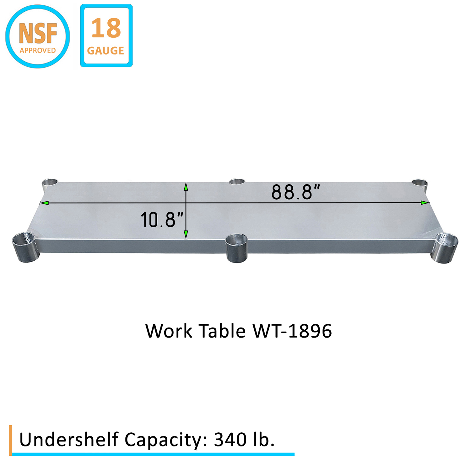 The undershelf seamlessly fits beneath your 18″ X 96″ work table, offering a convenient storage solution for tools, equipment, and supplies. Its robust construction supports heavy items, making it ideal for storing pots, pans, small appliances, and other essentials. The sleek stainless steel finish not only adds a professional look to your workspace but also makes cleaning and maintenance effortless.