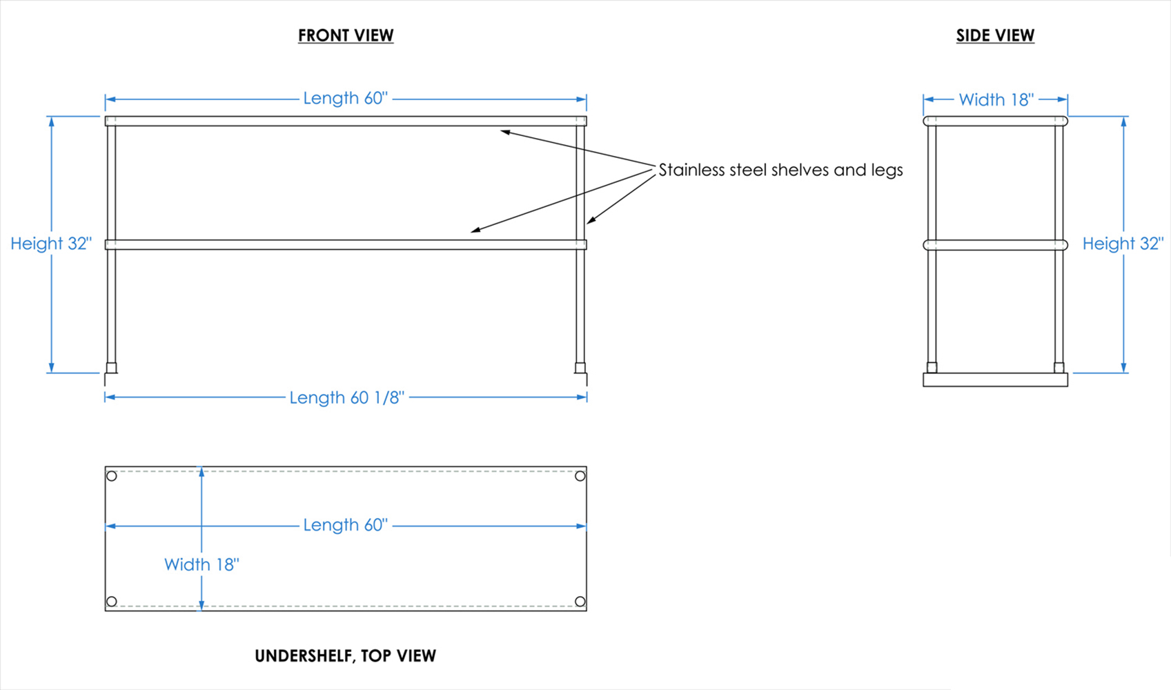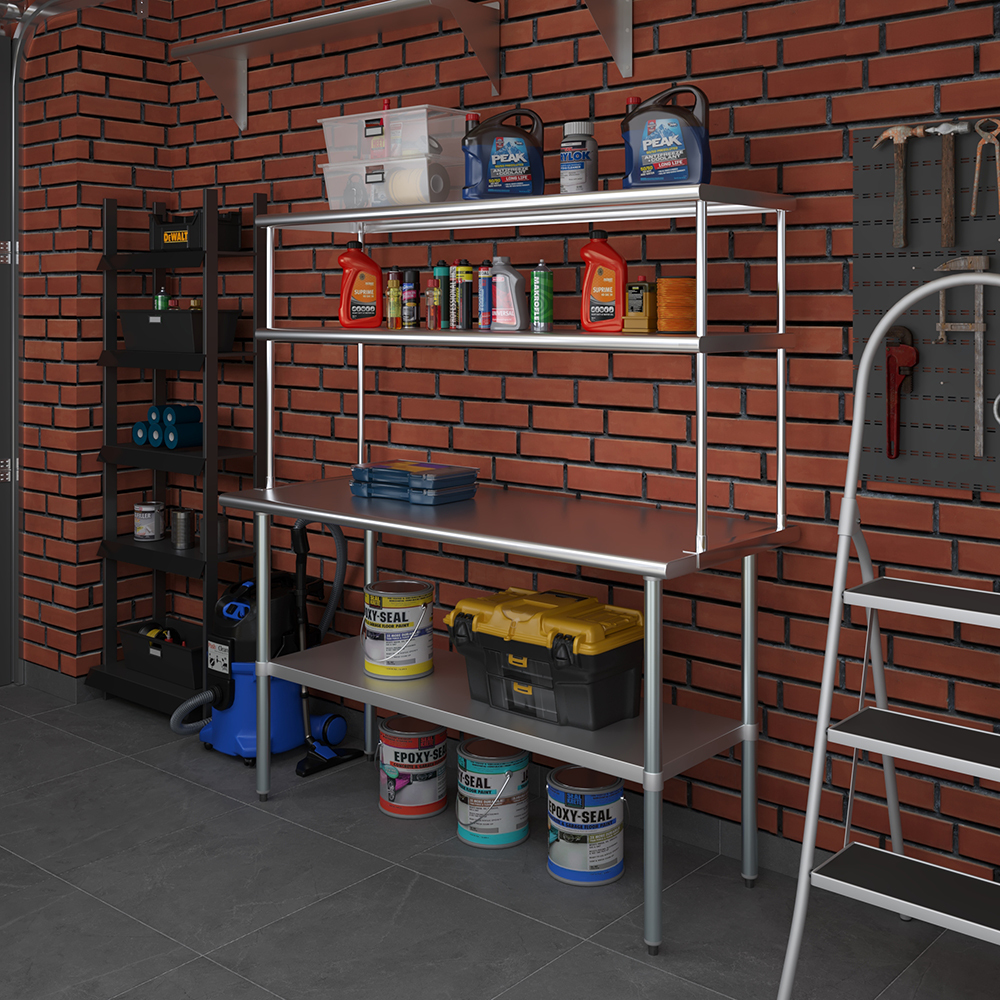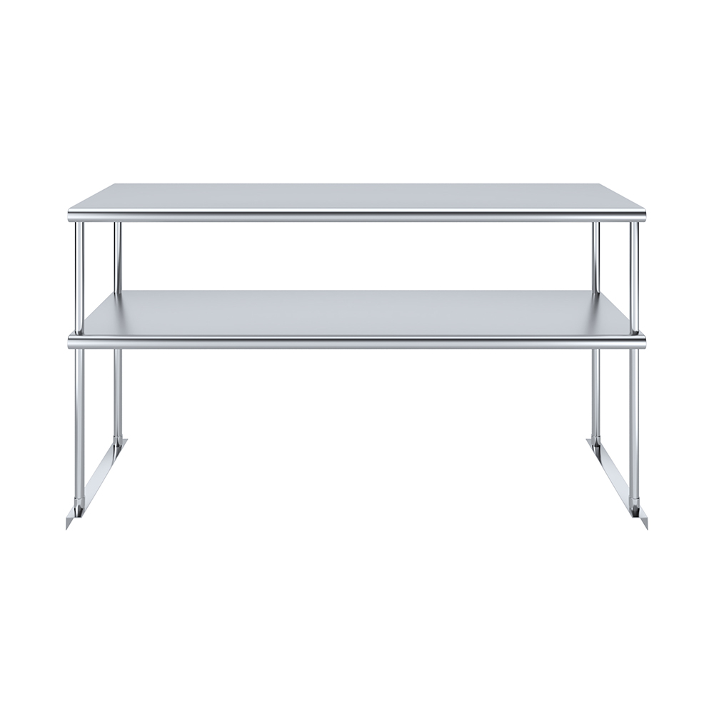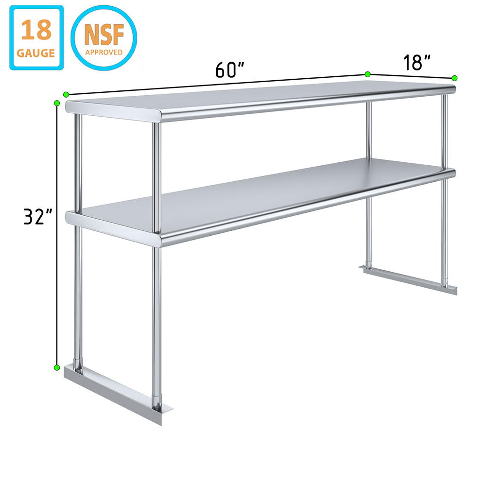 Measuring 18 inches in width and 60 inches in length, this compact yet spacious shelf offers ample storage space across two tiers. The double-tier design maximizes vertical storage capacity, making it ideal for organizing a variety of kitchen essentials, including utensils, ingredients, cookware, and equipment. The open-shelf design allows for easy access and quick retrieval of items, streamlining your workflow and improving productivity.