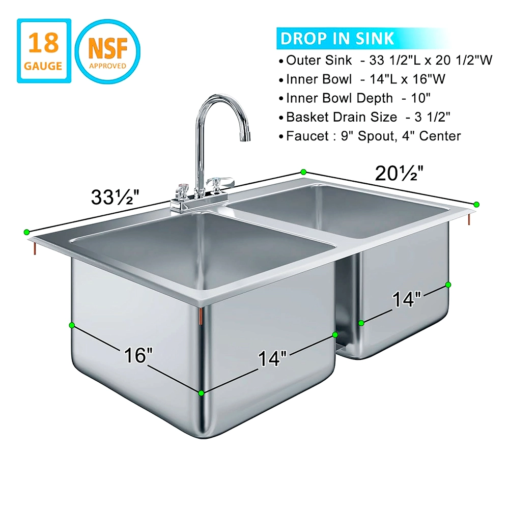 The Stainless Steel 2-Compartment Drop-In Sink is a versatile and durable solution designed to enhance efficiency in cleaning and prep tasks. Featuring two spacious 14 in. x 16 in. x 10 in. bowls, this sink provides ample room for multitasking, allowing you to separate washing, rinsing, or soaking tasks with ease. Whether for residential or commercial use, it’s an excellent addition to kitchens, bars, utility spaces, or food service setups.