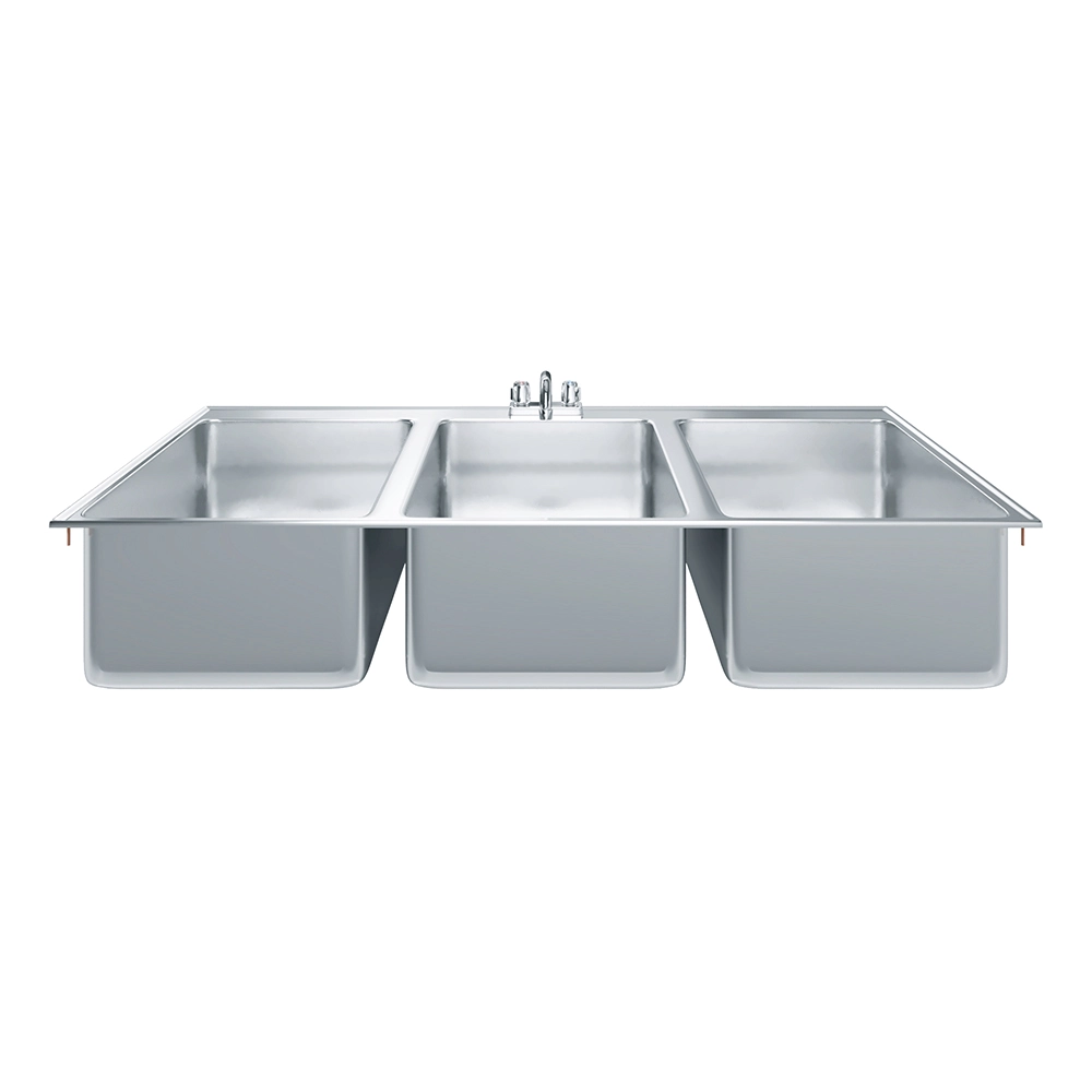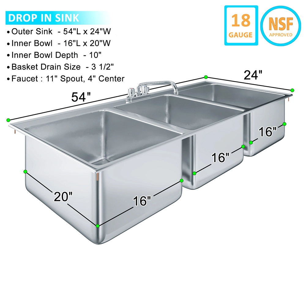 Stainless Steel 3 Compartment Drop-In Sink. Bowl 16 in. x 20 in. x 12 in. With Faucet