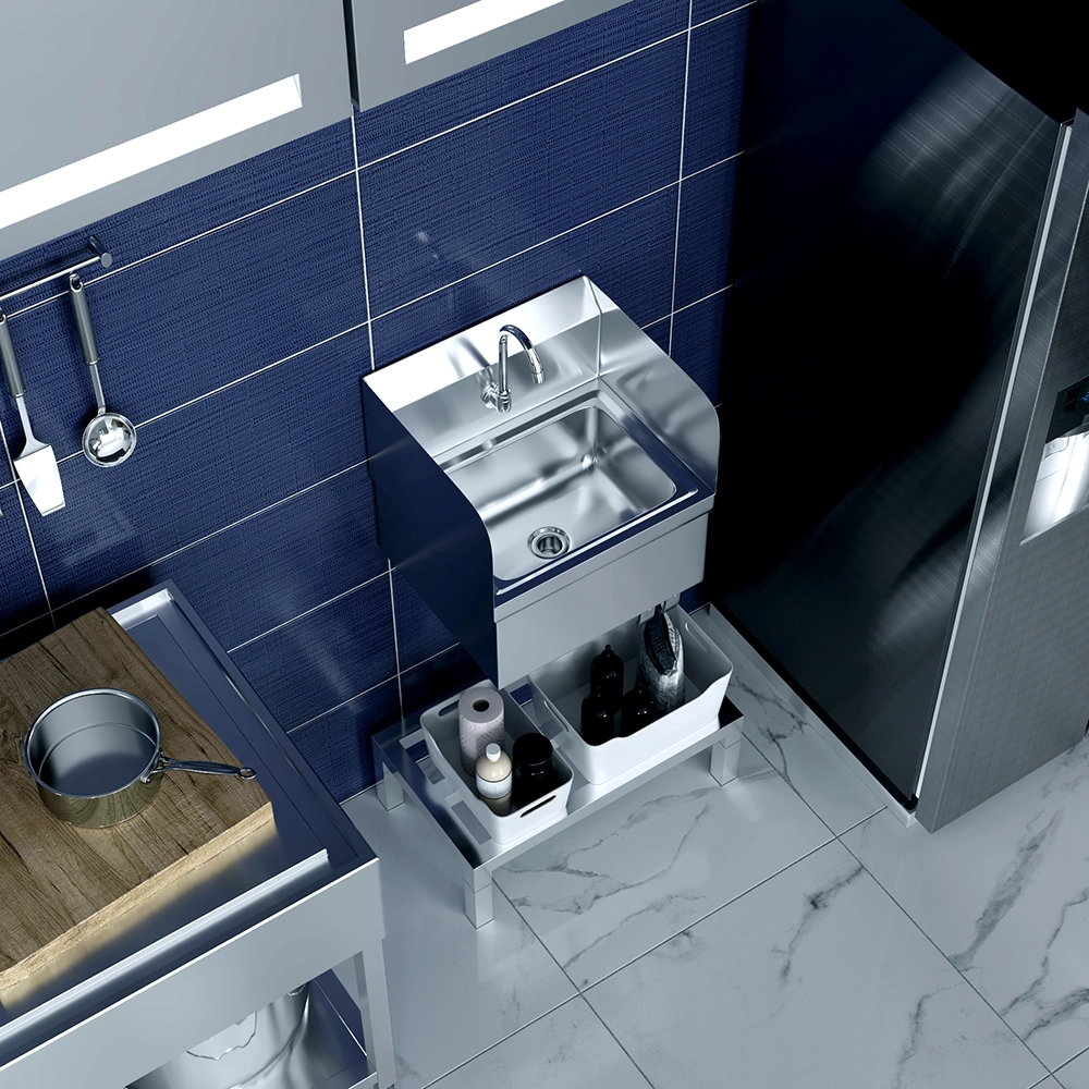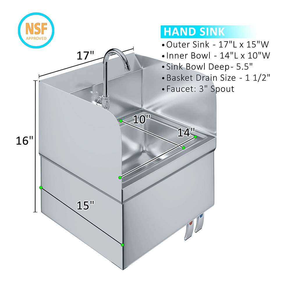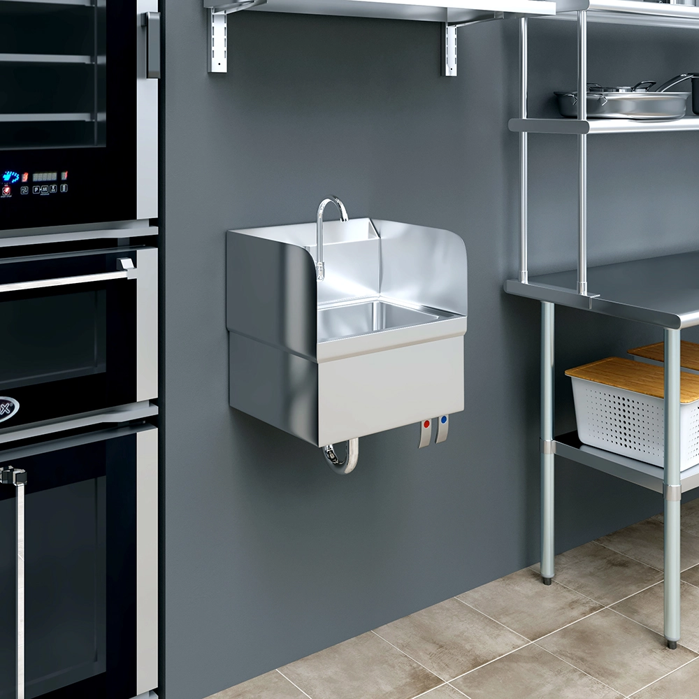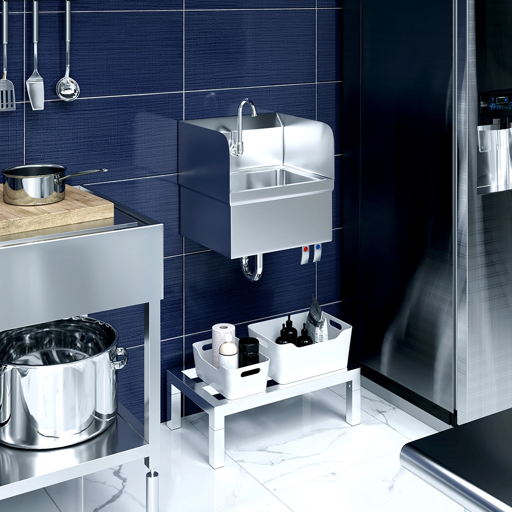 The Stainless Steel Hands-Free Wall-Mounted Hand Sink, measuring 17 in. x 15 in., is designed for maximum hygiene, durability, and efficiency in high-traffic environments. Constructed from 20GA/304 stainless steel, stains and daily wear, ensuring long-lasting performance in commercial kitchens, healthcare facilities, food service establishments, and restrooms. Its sleek, polished finish enhances cleanliness while maintaining a professional appearance.